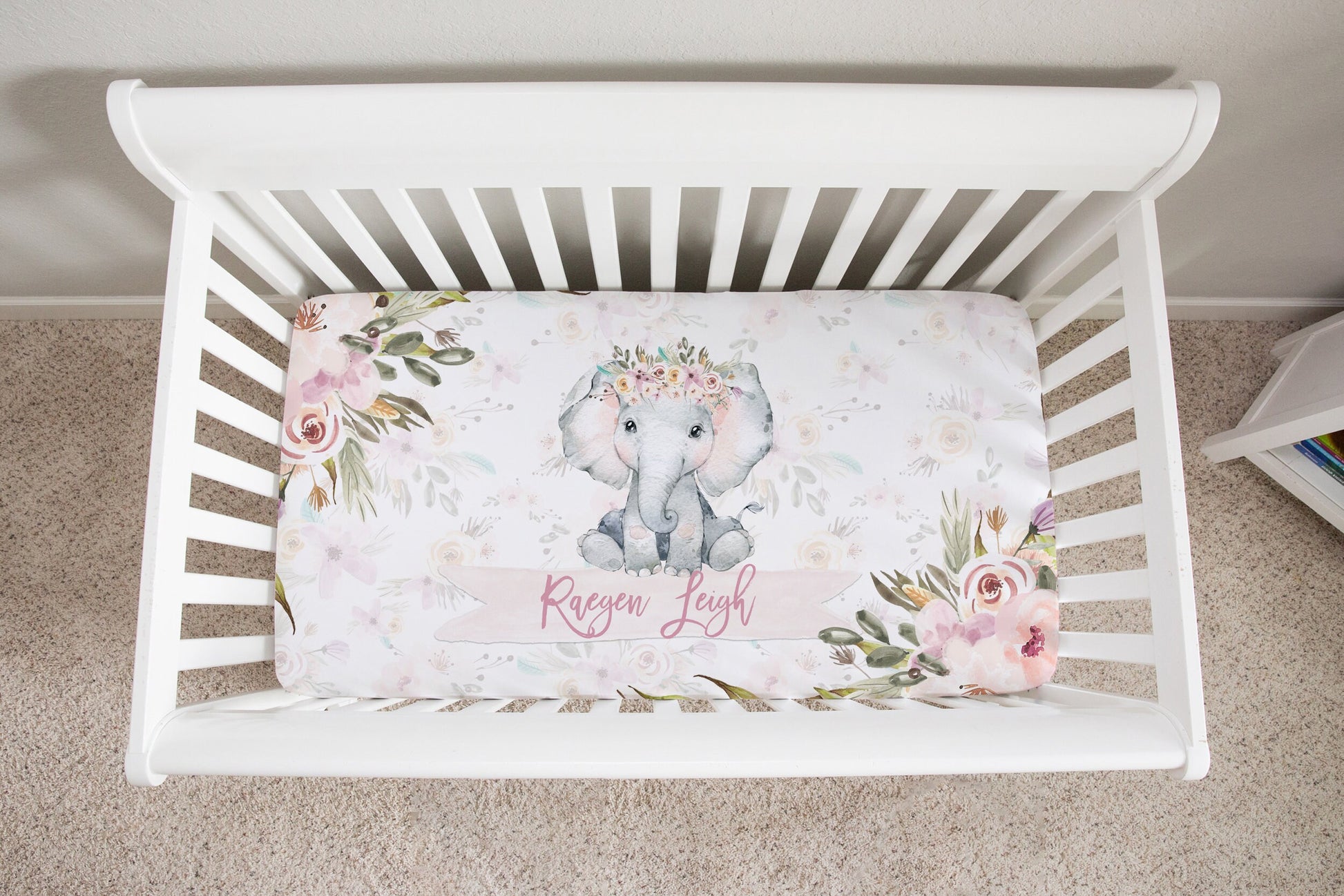 Grey Flowers with Elephant Personalized Crib Sheet for Girl