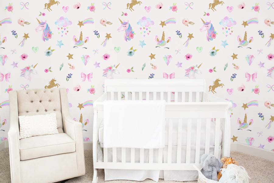 Unicorns nursery wallpaper, rainbows stars wallpaper, pink and gold unicorns wallpaper, unicorns themed nursery, unicorns nursery decor.
